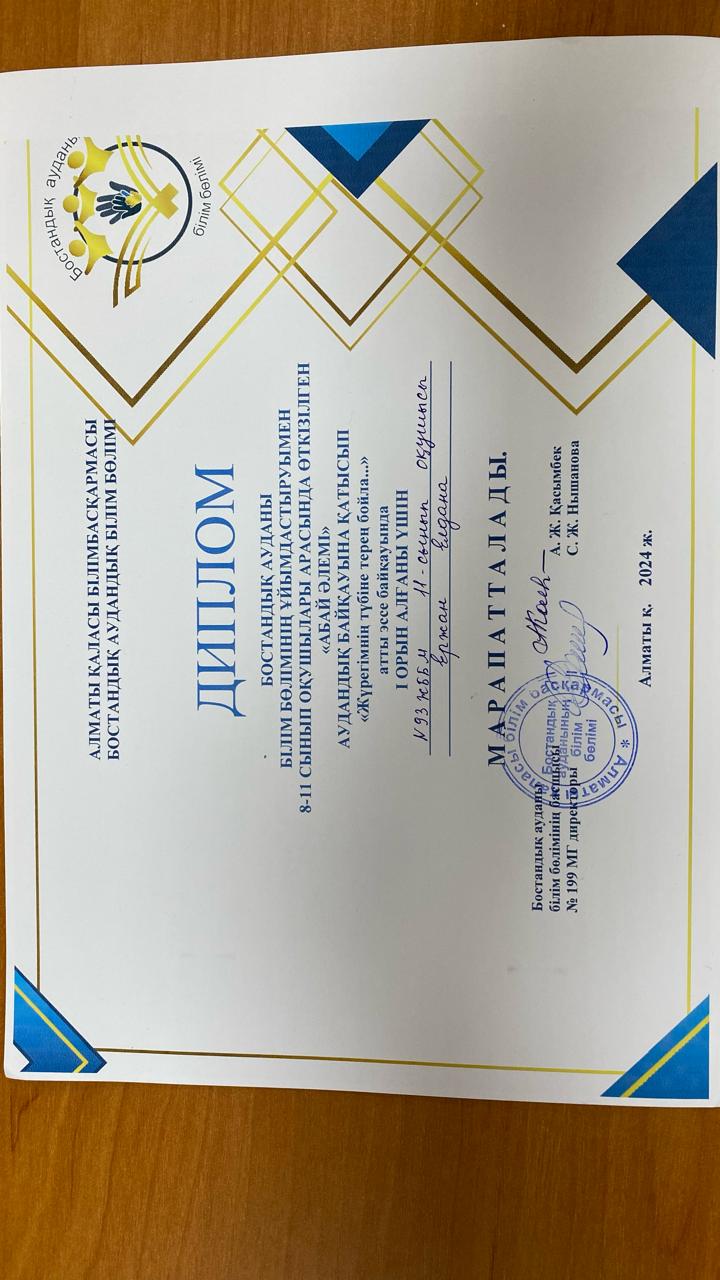 Мектебіміздің 11 "А" сынып оқушысы Ержан Елдана Бостандық ауданы білім бөлімінің ұйымдастыруымен өткізілген "Абай әлемі" аудандық байқауына "Жүрегімнің түбіне терең бойла..." атты эссе байқауында 1-орын алғаны үшін марапатталды. Жетекшісі Ш.З. Омарова