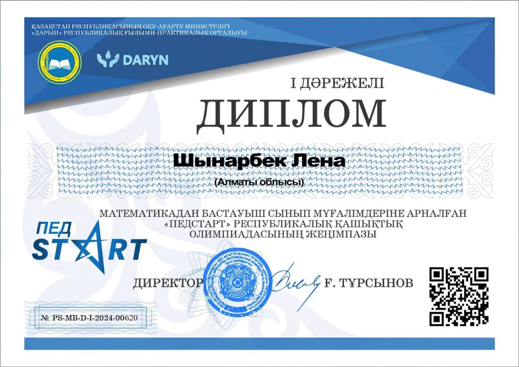 13 ақпан 2024 "Педстарт" Республикалық қашықтық олимпиадасы Математикадан бастауыш сынып мұғалімдеріне арналған "Педстарт" Республикалық қашықтық олимпиадасының жеңімпазы Шынарбек Лена.