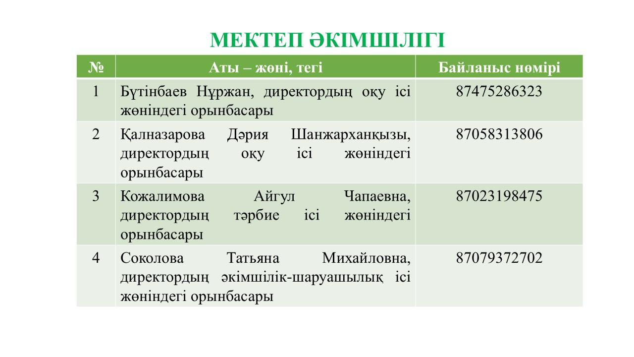 Мектеп әкімшілігінің байланыс телефондары. 2024-2025 оқу жылы