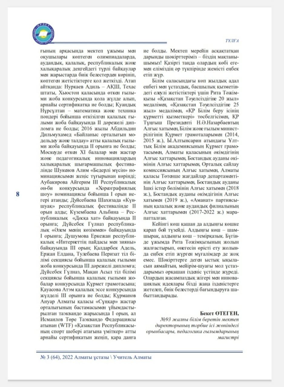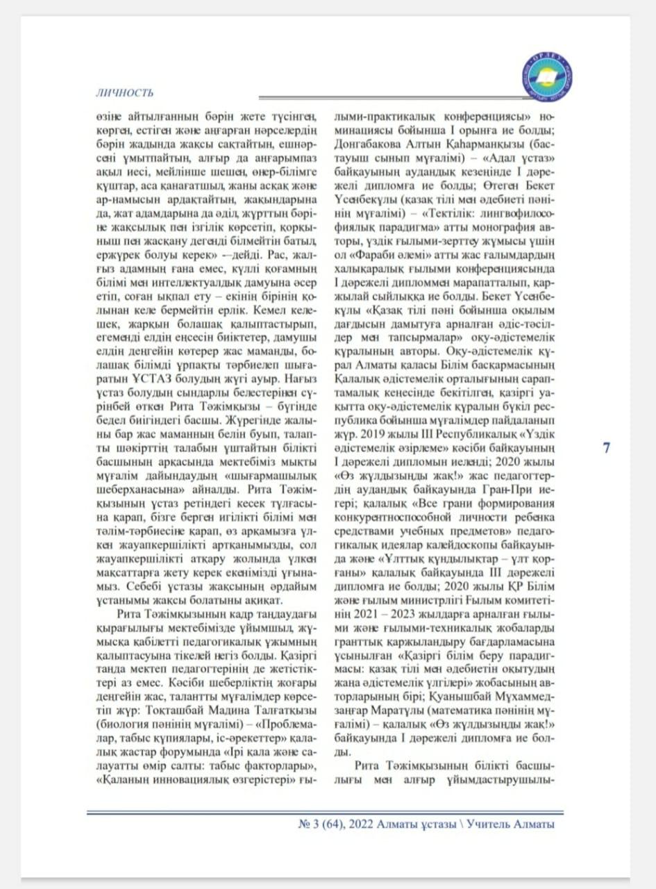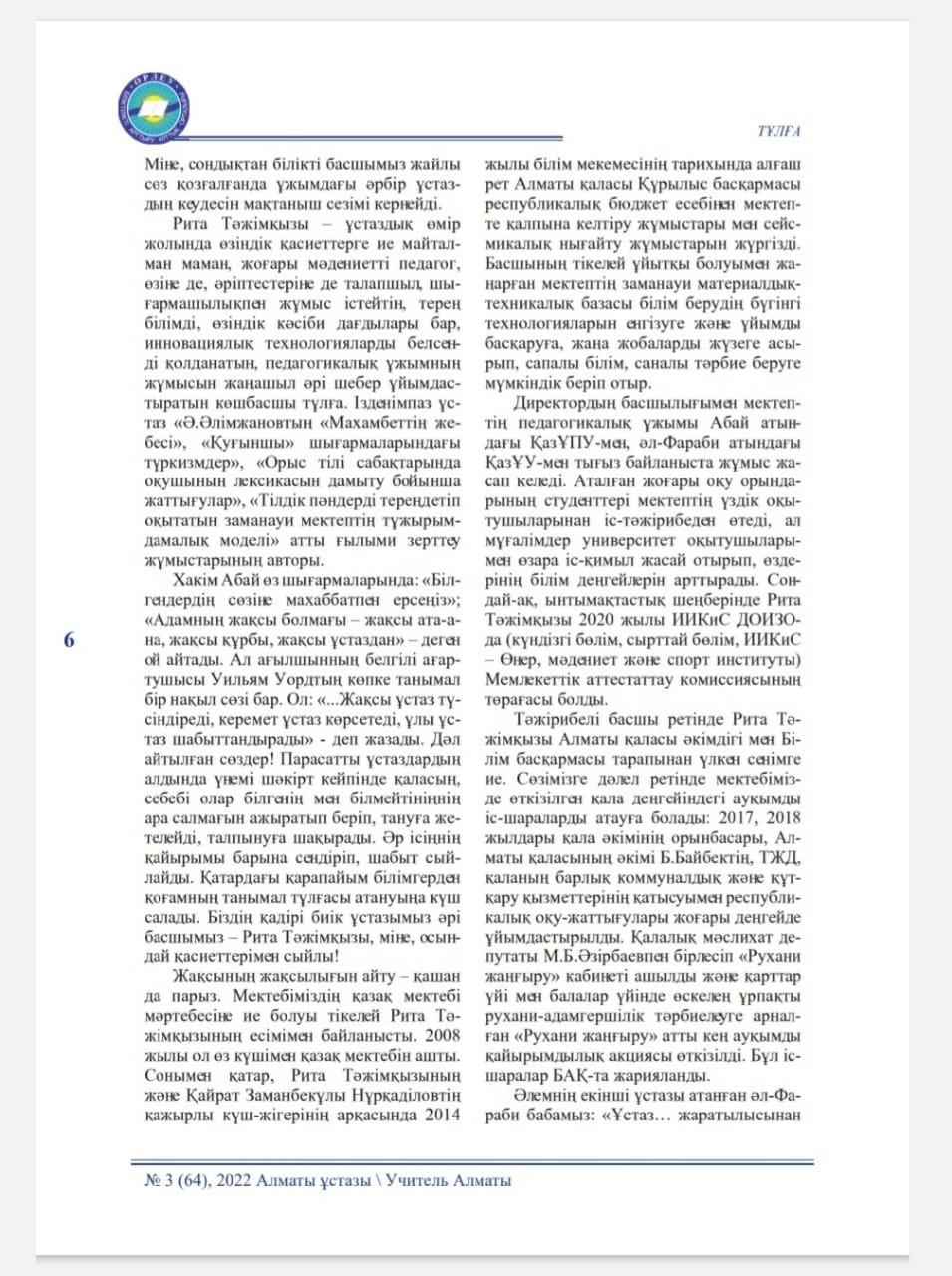 08 қараша 2022 БІЛІМ САЛАСЫНЫҢ БІЛІКТІ БАПКЕРІ Әріптесіміз, директордың тәрбие ісі жөніндегі орынбасары Өтеген Бекет Үсенбекұлының «Білім саласының білікті бапкері» тақырыбындағы мақаласы республикалық «Менеджеры образования Казахстана» және «Алматы ұстазы» журналдарында жарық көрді.