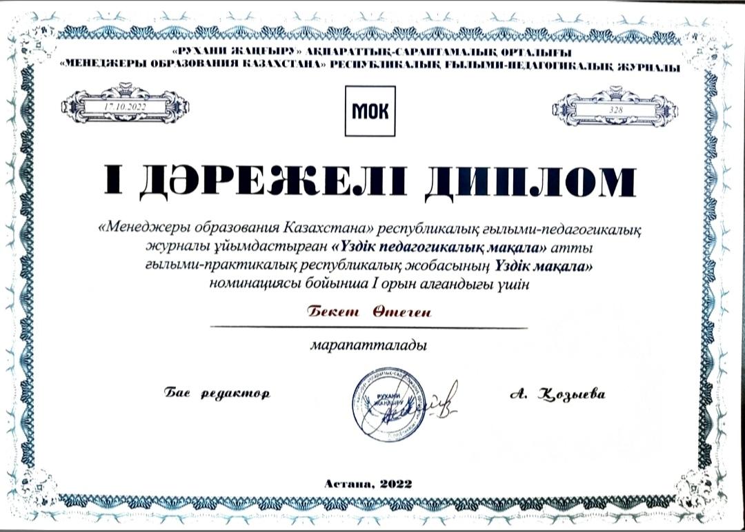 «Менеджеры образования Казахстана» республикалық ғылыми-педагогикалық журналы ұйымдастырған байқауда әріптесіміз, директордың тәрбие ісі жөніндегі орынбасары Өтеген Бекет Үсенбекұлы жеңімпаз атанып, I дәрежелі дипломға ие болды. Шығармашыл әріптесімізді жеңісімен шын жүректен құттықтаймыз!