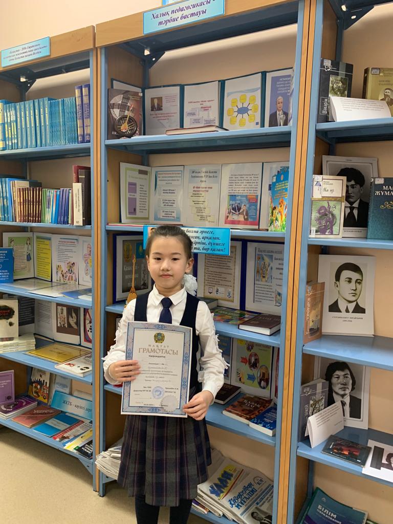 Бостандық ауданы білім бөлімінің ұйымдастыруымен 2-4-сыныптар арасында шахматтан өткізілген аудандық олимпиадада мектебіміздің 3-сынып оқушысы Қасымбек Аяла III орынға ие болып, жүлдегер атанды. Жас бүлдіршінімізді шын жүректен құттықтаймыз!