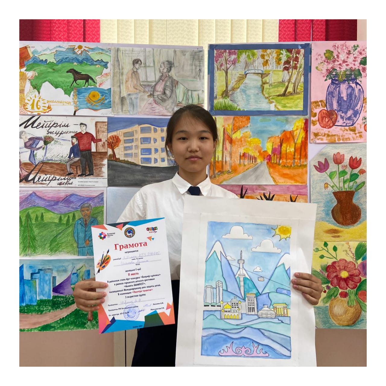 Халықаралық балаларды қорғау күніне арналған «Алматы БАЛАFEST» фестивалі аясында ұйымдастырылған «Бояулар құпиясы» арт-конкурсының аудандық кезеңінде мектебіміздің 8-сынып оқушысы Ильясова Камила жүлдегер атанып, II орынға ие болды. Талантты шәкіртімізді шын жүректен құттықтаймыз!