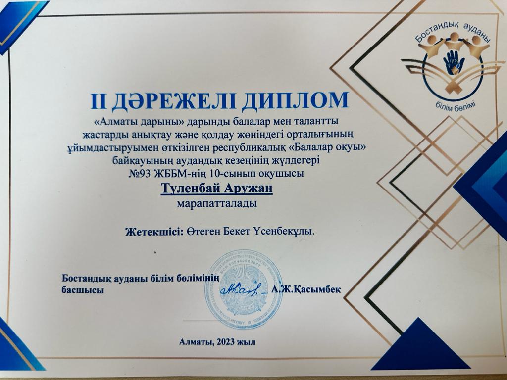 Алматы қаласы Білім басқармасының «Алматы дарыны» дарынды балалар мен талантты жастарды анықтау және қолдау жөніндегі орталығының ұйымдастыруымен өткізілген республикалық «Балалар оқуы» байқауының аудандық кезеңінде мектебіміздің 10-сынып оқушысы Туленбай Аружан II дәрежелі дипломға ие болды. Шәкіртімізді марапатымен шын жүректен құттықтаймыз!