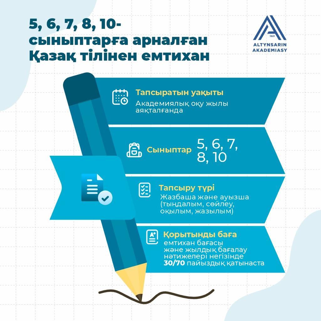 2023-2024 оқу жылында 5, 6, 7, 8, 10 сынып оқушылары оқу жылды аяқтаған кезде қазақ тілінде оқытатын сыныптарда “Қазақ тілі“ пәні бойынша емтихан тапсырады.