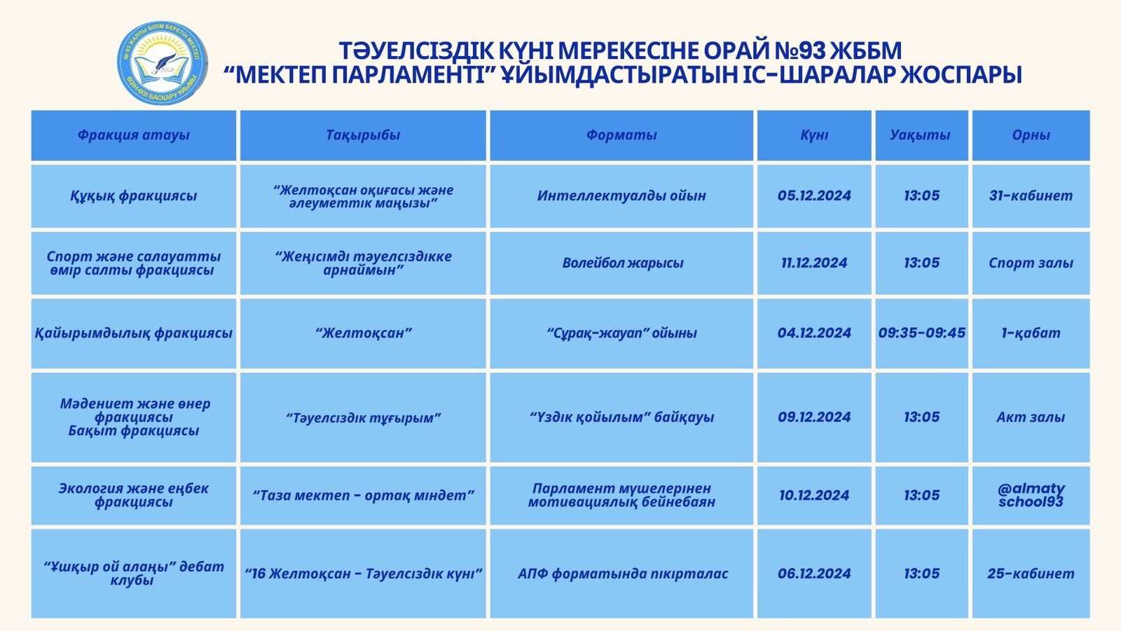 09 желтоқсан 2024 “МЕКТЕП ПАРЛАМЕНТІ” ЖОСПАРЫ “МЕКТЕП ПАРЛАМЕНТІ” ЖОСПАРЫ№93 жалпы білім беретін мектебі “МЕКТЕП ПАРЛАМЕНТІ” өзін-өзі басқару ұйымының Тәуелсіздік күні мерекесіне орай ұйымдастыратын іс-шараларын ұсынады.