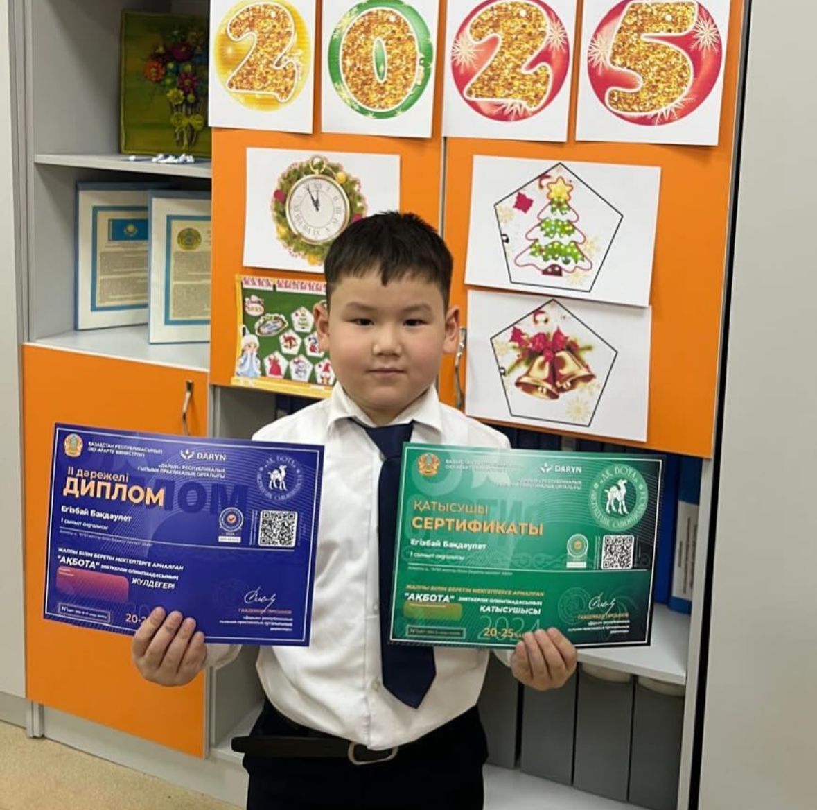 26 желтоқсан 2024 МЕКТЕП МАҚТАНЫШТАРЫ МЕКТЕП МАҚТАНЫШТАРЫАҚБОТА зияткерлік олимпиадасының жүлдегері 1”А” сынып оқушысы ЕГІЗБАЙ БАҚДӘУЛЕТ ll дәрежелі дипломмен марапатталды. Оқушымызды шын жүректен құттықтаймыз!