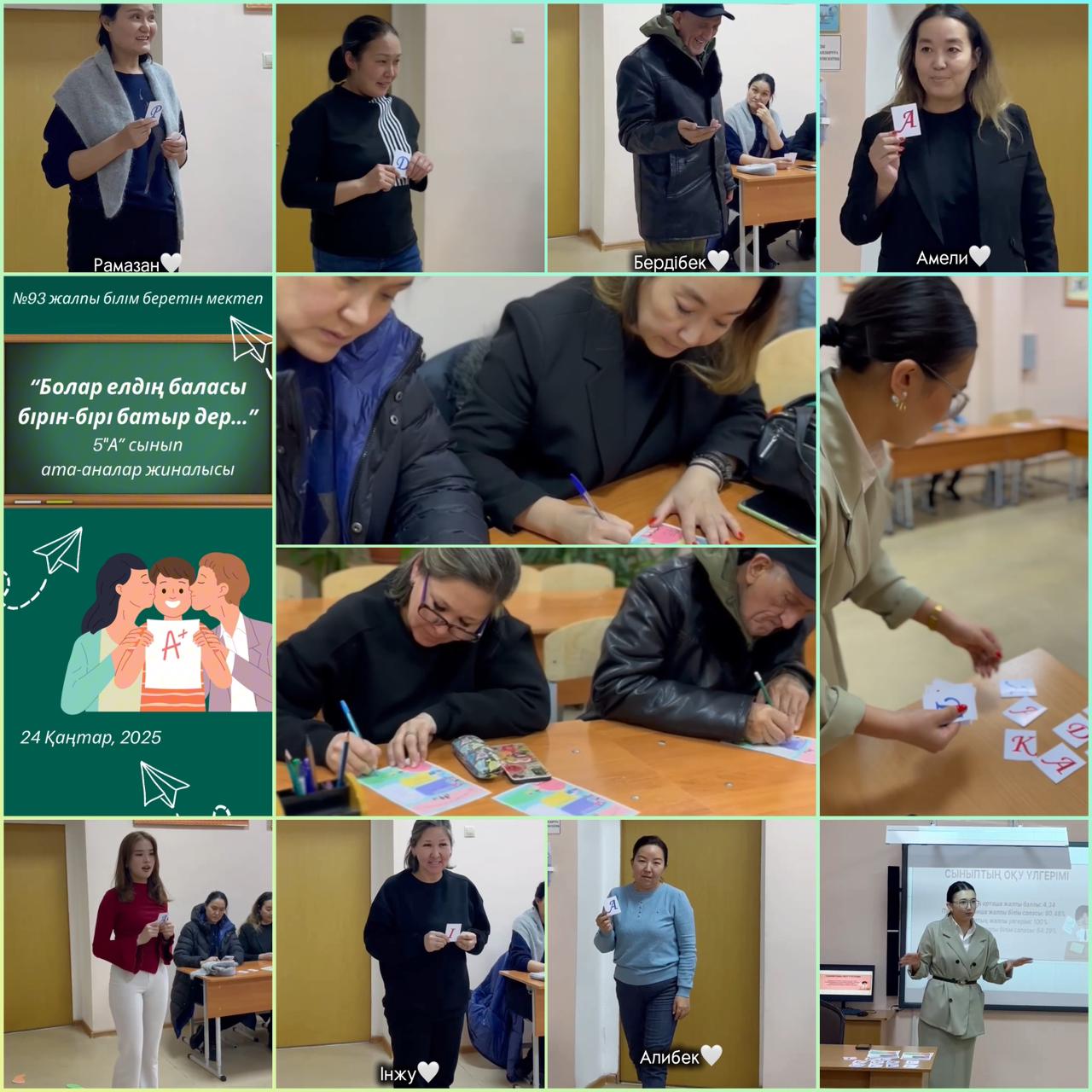 2025 жылдың қаңтар айындағы №93 жалпы білім беретін мектебі “Ата-аналарды педагогикалық қолдау” орталығының жұмыс жоспарына сәйкес 5”А” сыныбында “Болар елдің баласы бірін-бірі батыр дер..” тақырыбында ата-аналар жиналысы өтті.