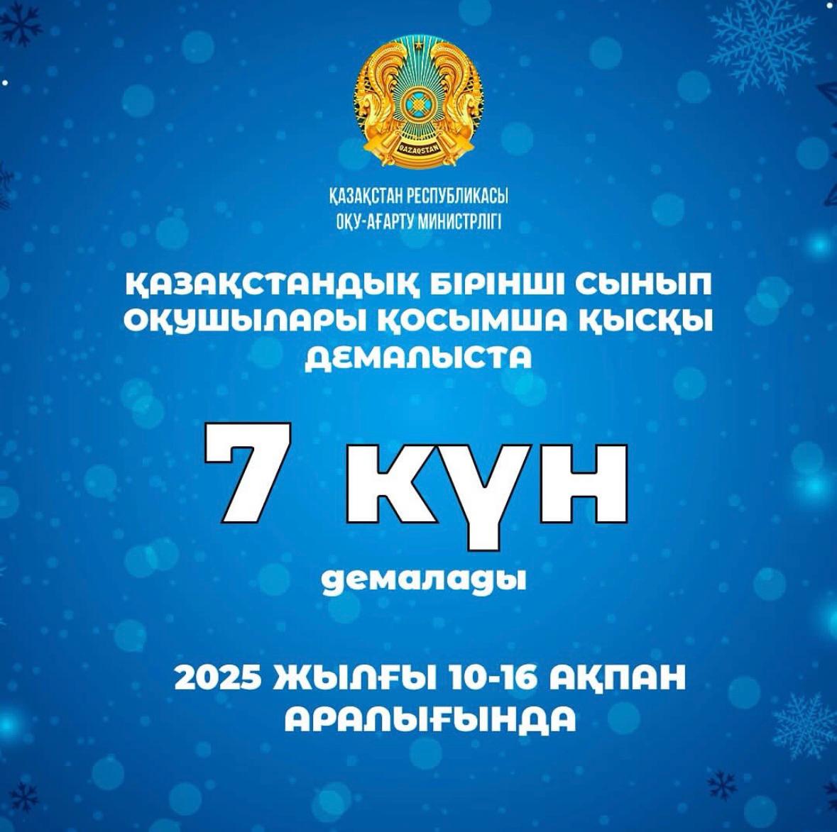 29 қаңтар 2025 1-СЫНЫП ҚОСЫМША ДЕМАЛЫС КҮНДЕРІ 1-СЫНЫП ҚОСЫМША ДЕМАЛЫС КҮНДЕРІҚазақстандық бірінші сынып оқушылары қосымша қысқы демалыста 7 күн демалады. 1-сыныпта білім алушыларға 2025 жылғы 10-16 ақпан аралығында (күнтізбелік 7 күн) қосымша демалыс беріледі.