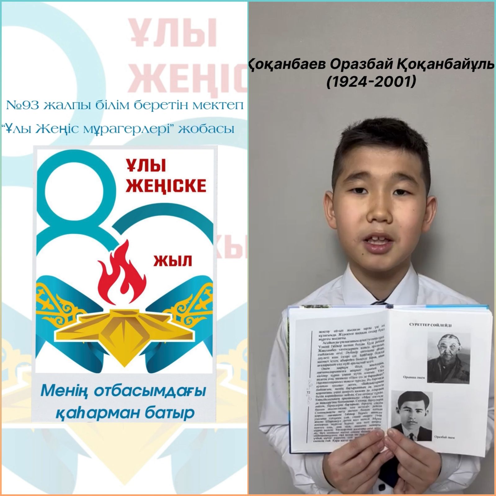 🔹Ұлы Жеңіске 80 жыл толуына орай “Ұлы Жеңіс мұрагерлері” жобасы аясында “Менің отбасымдағы қаһарман батыр” айдарының қатысушысы 5 “А” сынып оқушысы Бейбіт Алиасқар.