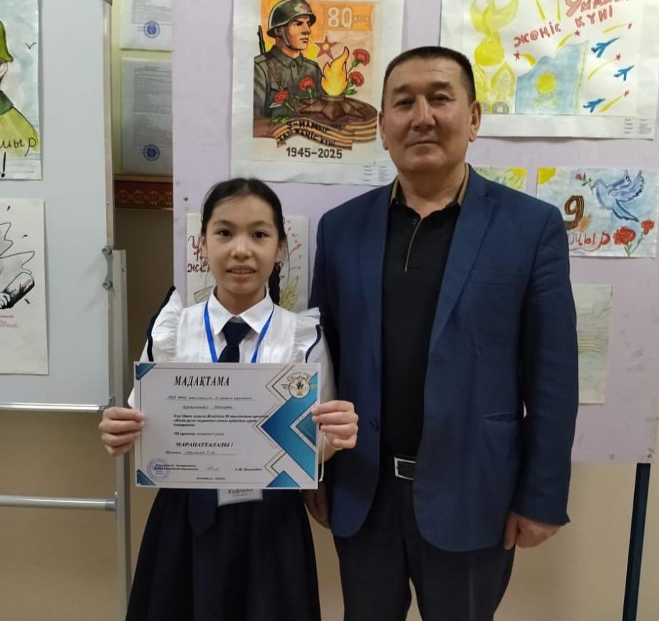 Ұлы Отан соғысы Жеңісінің 80 жылдығына арналған “Жеңіс рухы - жүректе” атты аудандық сурет байқауында жүлделі ІІІ орынды иеленгені үшін №93 жалпы білім беретін мектебінің 5«Ә»сынып оқушысы Нұрмуханбет Хадиджа марапатталды.