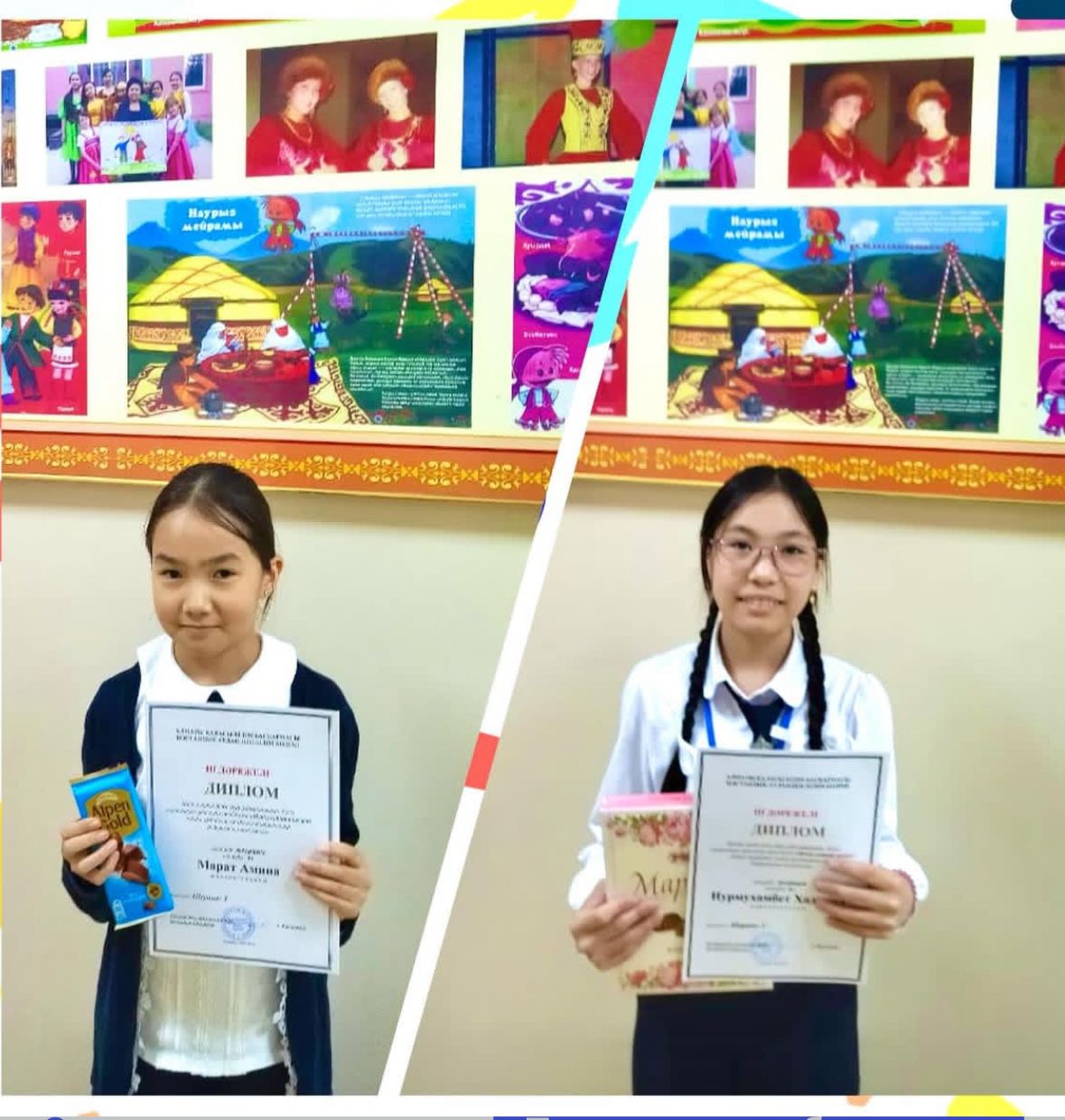 Жалпы орта білім беру ұйымдарының білім алушылары арасында өткізілген «Менің сүйікті қалам» атты аудандық сәндік-қолданбалы өнер байқауының жеңімпазы атанып, жүлделі ІІІ орын иеленген 5 «Ә» сынып оқушысы Марат Амина және 6 «Ә» сынып оқушысы Нурмухамбет Хадиджа марапатталды.