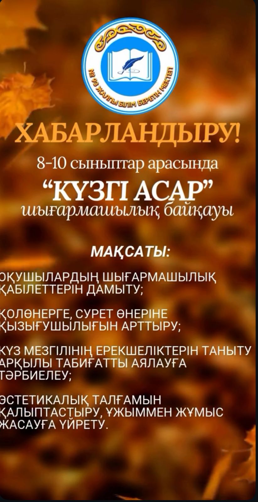 «Адал Азамат» біртұтас тәрбие бағдарламасын іске асыру жұмысы барысында «Еңбегі адал жас өрен» жобасы аясында 8-10 сыныптар арасында «Күзгі асар» шығармашылық байқауы өткізілетінін хабарлаймыз!