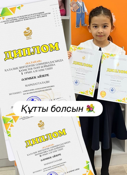 «Балапан» қалалық зияткерлік олимпиадасында қазақ тілі пәні бойынша І орын және математика пәні бойынша ІІ орын алғаны үшін 2 «Ә» сынып оқушысы Әлімбек Айзере марапатталды.