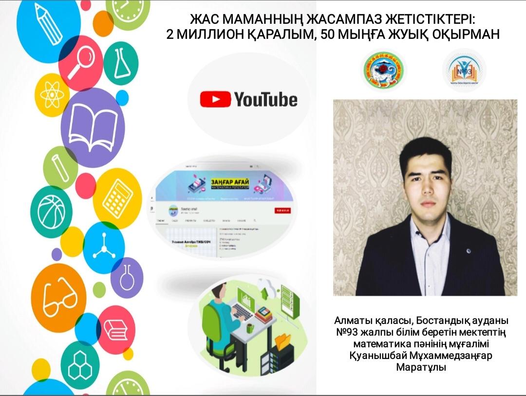 Жас ұстаз еліміздегі карантин шектеулері басталмастан бұрын өз Youtube каналын ашып, оқушыларға математика пәні бойынша онлайн сабақтар дайындай бастады. 1 жылдың ішінде «ЗАҢҒАР АҒАЙ» YOUTUBE АРНАСЫНДАҒЫ ТҰРАҚТЫ ОҚЫРМАНДАРЫНЫҢ САНЫ 50 МЫҢҒА, АЛ, АРНАДАҒЫ ҚАРАЛЫМ САНЫ 2 МИЛЛИОНҒА ЖУЫҚТАДЫ! Бүгінде бұл арна республика ұстаздары мен оқушыларының математика пәні бойынша білімі мен білігін тереңдетіп, дамытатын арнасына айналды.