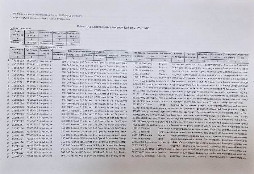 2025 жылға арналған мемлекеттік сатып алу жоспары