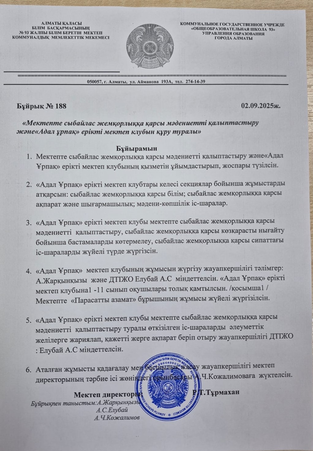 Сыбайлас жемқорлыққа қарсы күрес бұйрық 2024-2025 оқу жылы