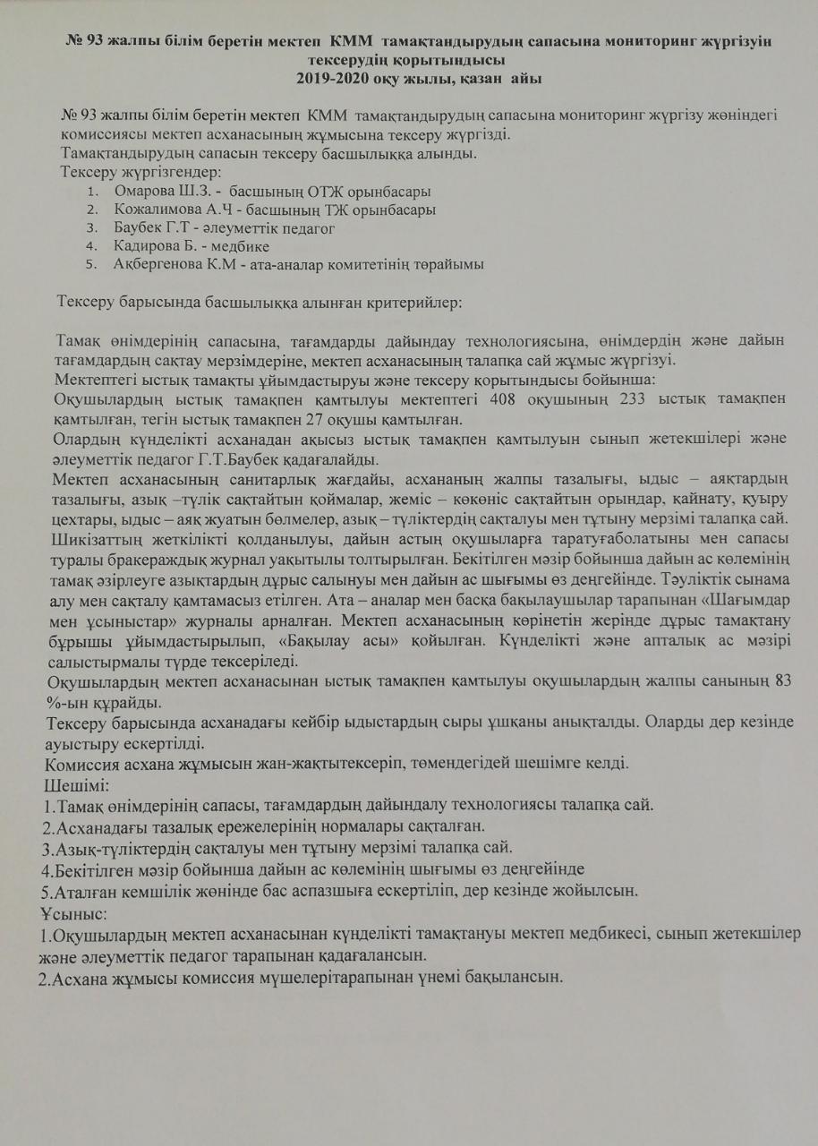 » Тамақтандырудың сапасына мониторинг жүргізуін тексерудің қорытындысы