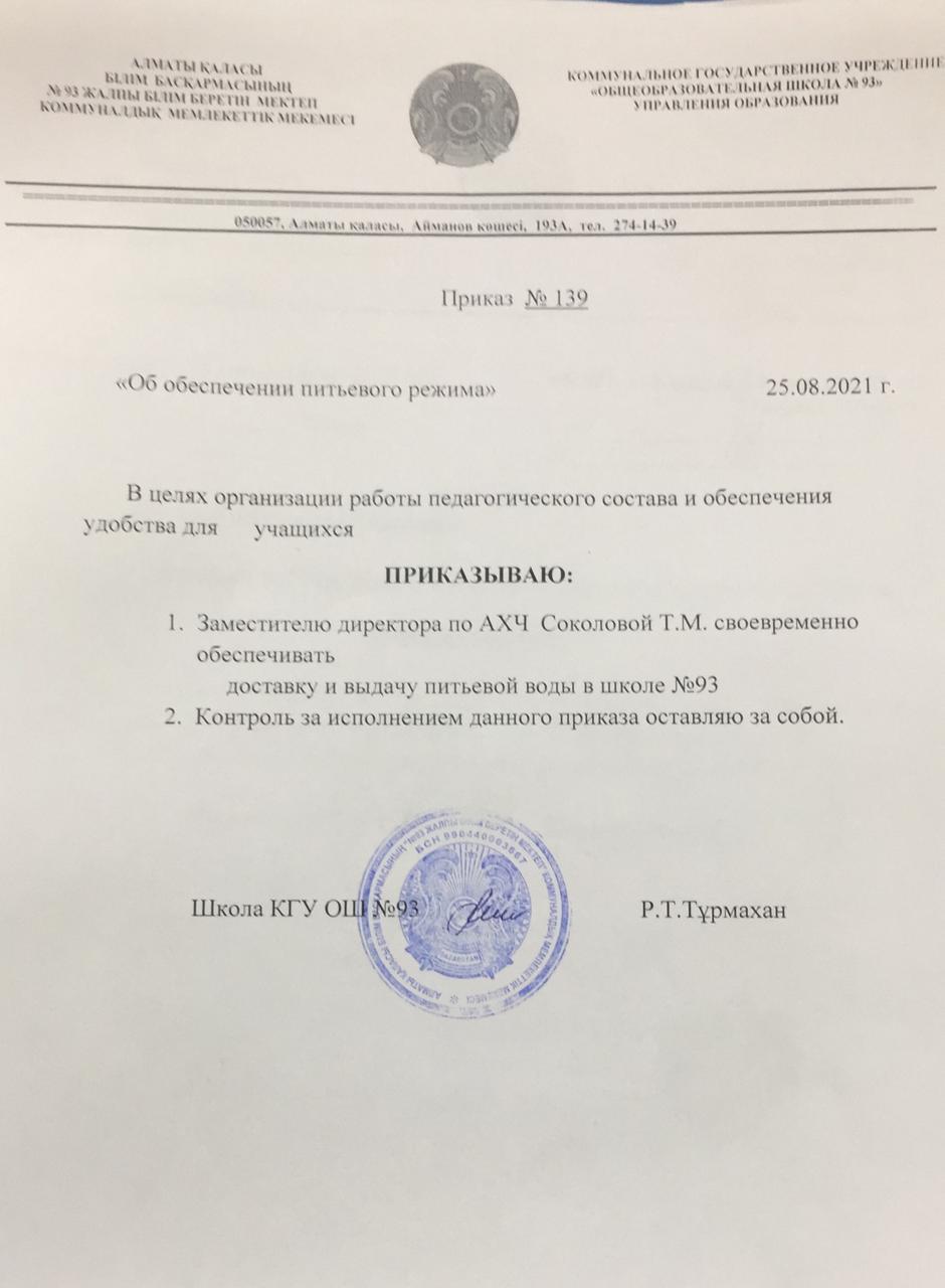 Ауыз су режимі бойынша бұйрық