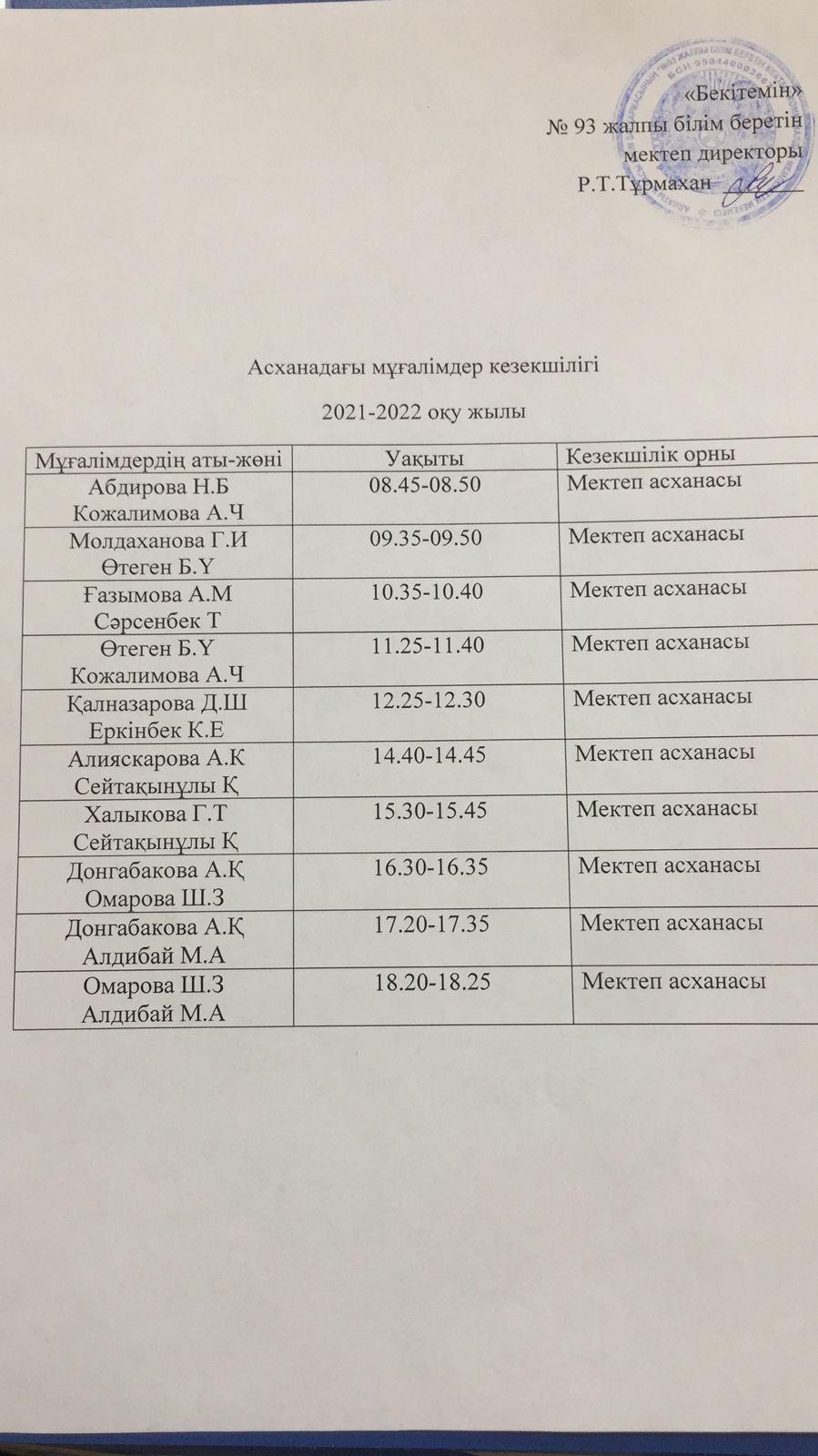 Асханадағы мұғалімдер кезекшілігі 2021-2022 оқу жылы