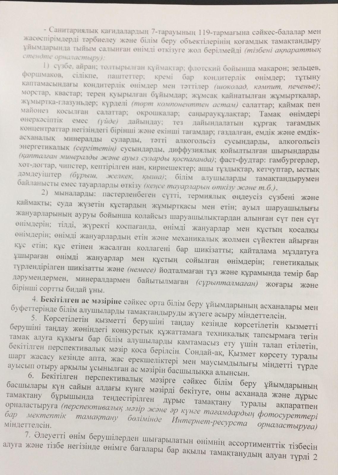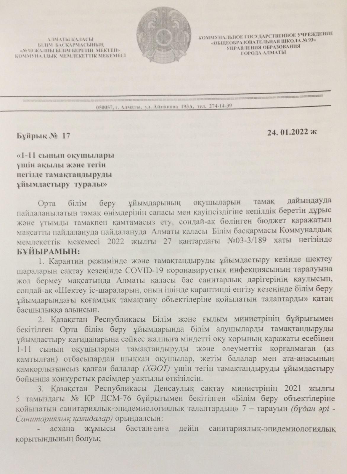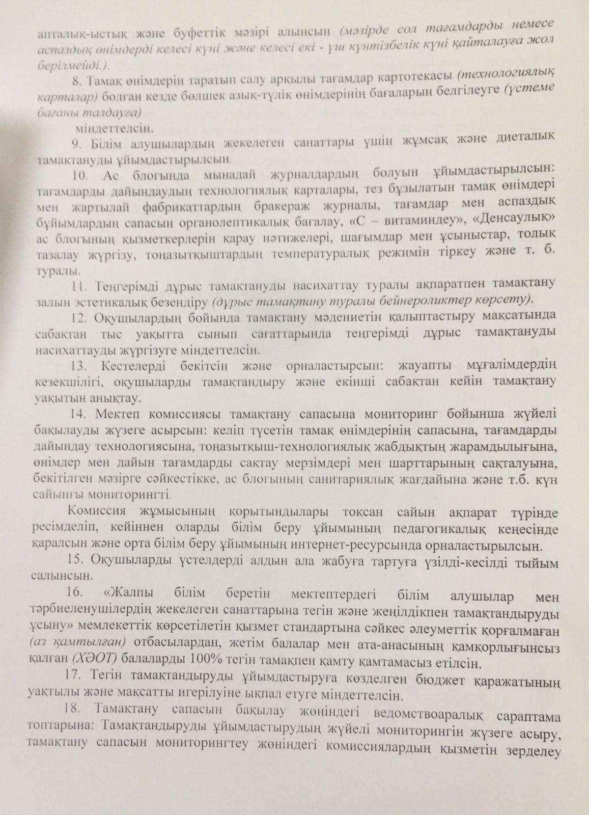 Алматы қаласы Білім басқармасының оқушыларды тамақтандыру кезінде сапалы және денсаулыққа қауіпсіз тамақ өнімдерімен қамтамасыз ету