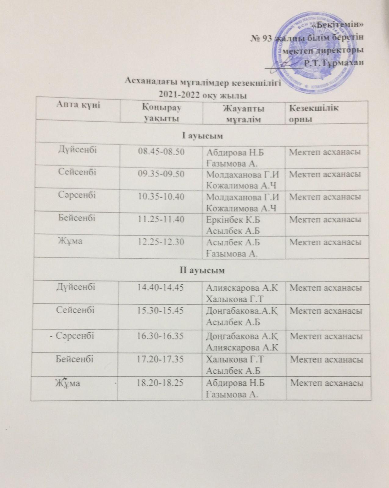 Асханадағы мұғалімдер кезекшілігі 2021-2022 оқу жылы