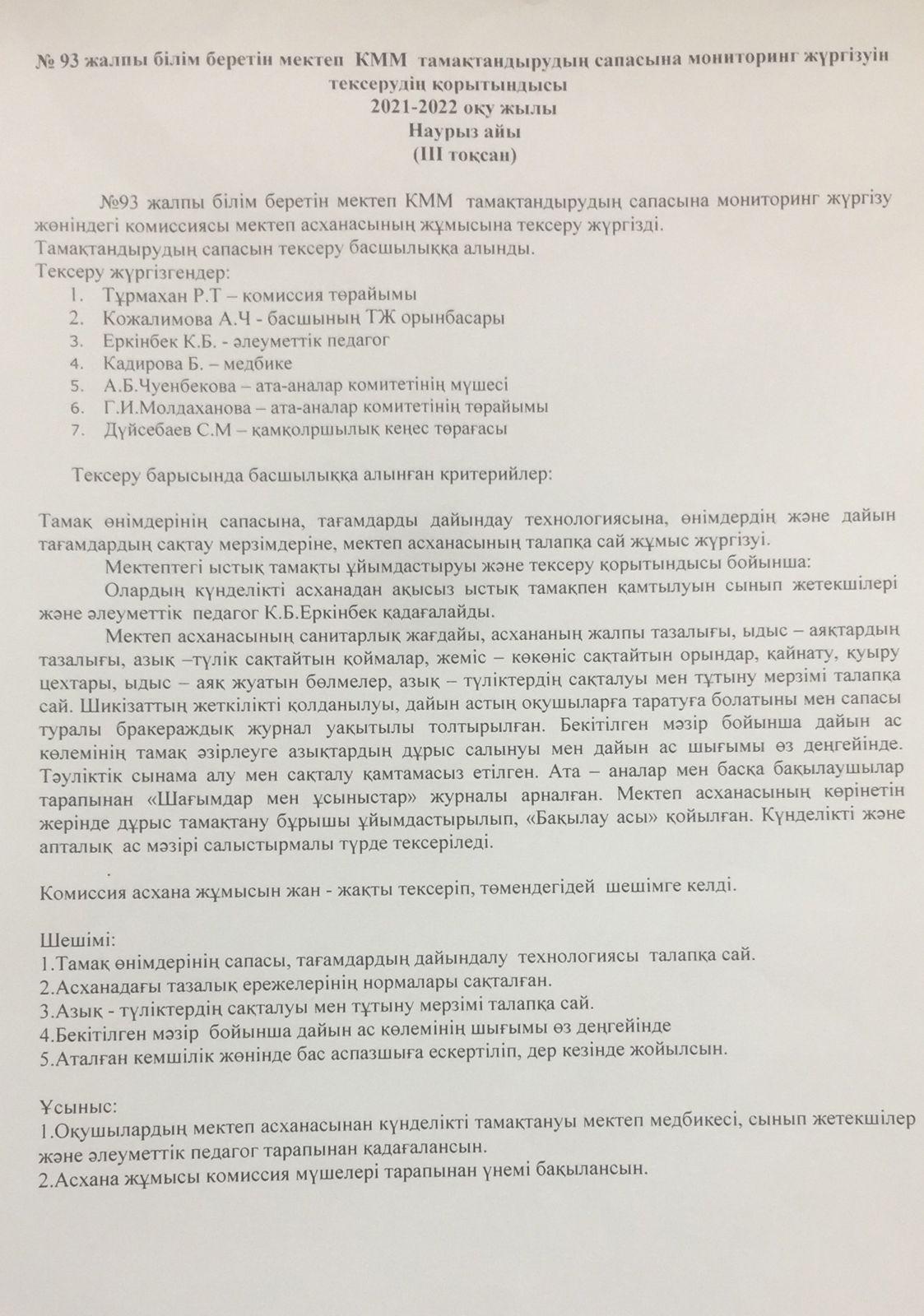 Тамақтану сапасына мониторинг жүргізу қорытындысы 2021-2022 оқу жылы
