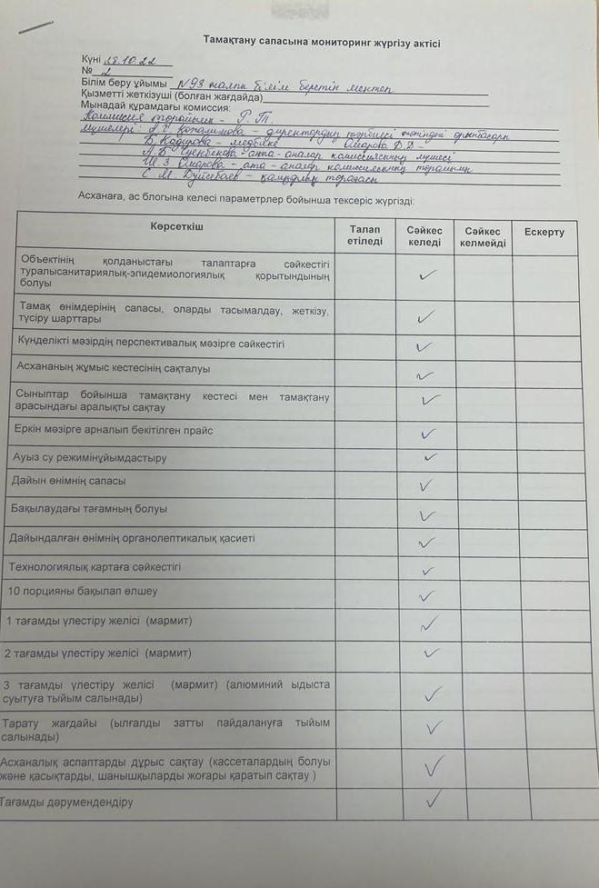 Тамақтану сапасын мониторинг жүргізу актісі . Қазан айы