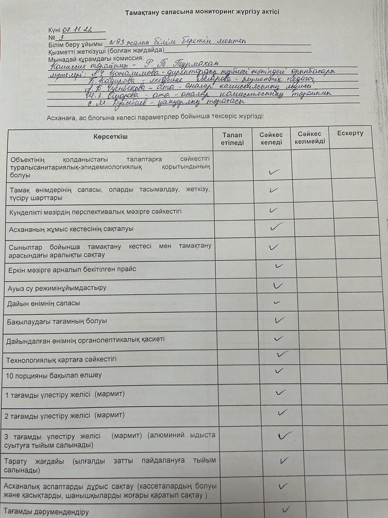 Тамақтану сапасына мониторинг жүргізу актісі