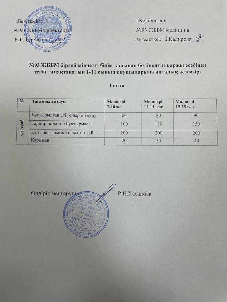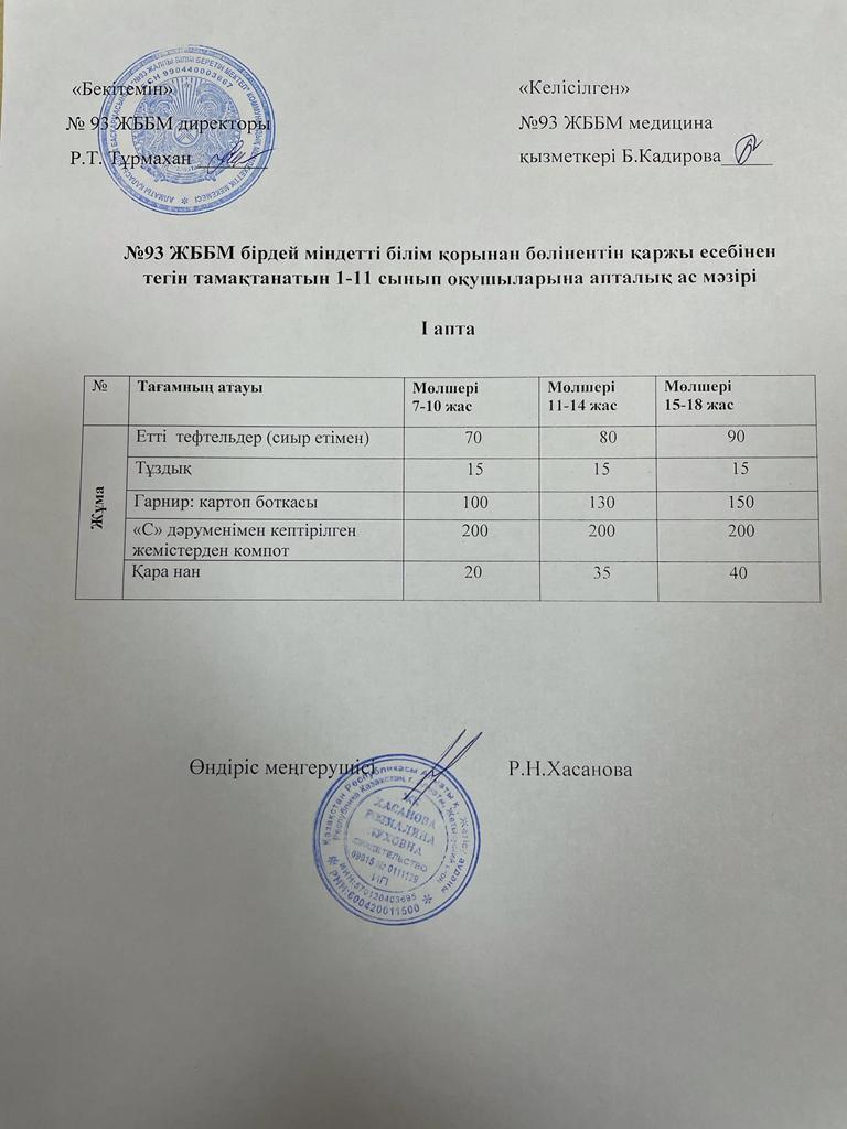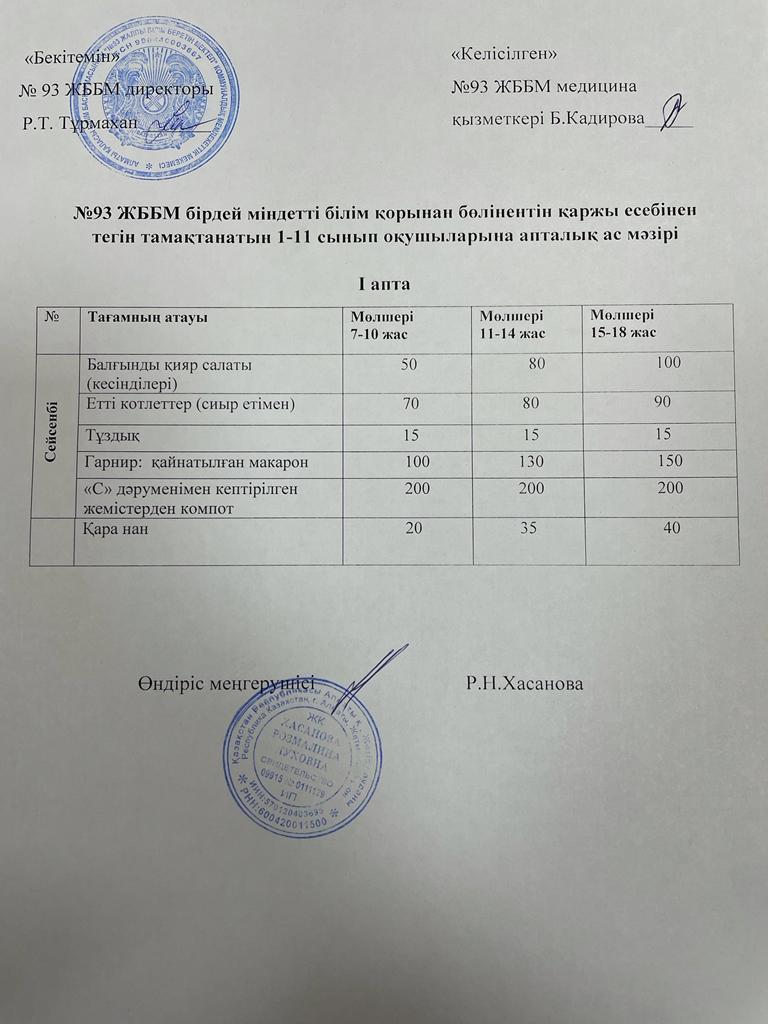 Жалпыға бірдей міндетті оқу қоры есебінен тегін тамақтанатын оқушылардың ас-мәзірі І, ІІ, ІІІ, ІV апта